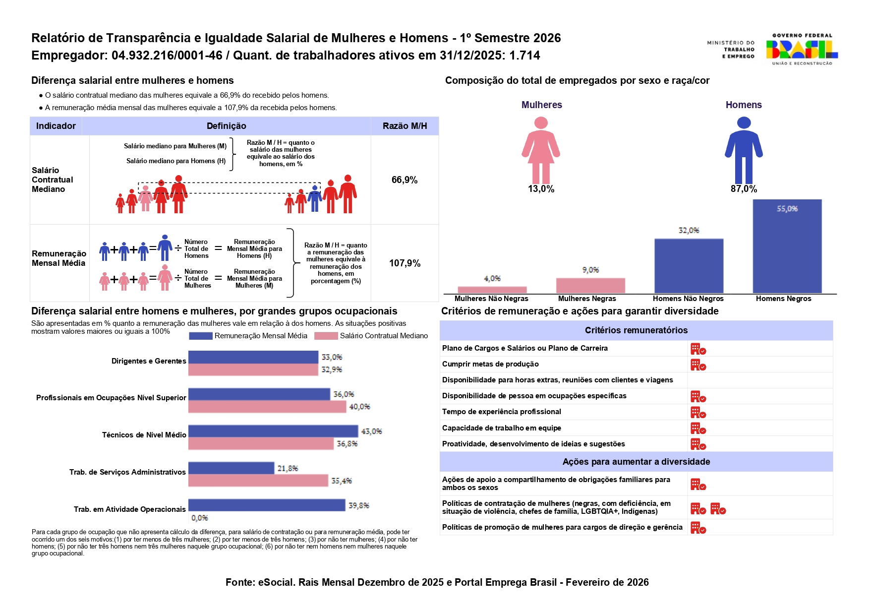 Para garantir a transparência dos nossos processos de pessoas, disponibilizamos abaixo o Relatório de Transparência Salarial e de Critérios Remuneratórios elaborado pelo Ministério do Trabalho e Emprego com dados da Rais dezembro 2025.
